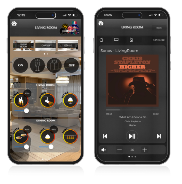 À l’aide d’un smartphone, d’une tablette, d’une dalle tactile ou d’un ordinateur, en local ou à distance, vous aurez la possibilité de piloter l’intégralité de votre installation domotique : visualisation de vos caméras, contrôle de votre matériel audiovisuel, de votre chauffage, de votre climatisation, de votre vidéo portier, de vos éclairages, de vos volets roulants, ... Le tout avec une interface graphique ludique et personnalisée.